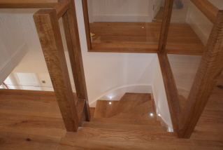 The most economical way to connect two different levels is by building a staircase. The design of the staircase is controlled by Building Regulations concerning strength, stability, fire resistance and general safety factors. Pitch Line - a line joining the front edges of the treads (nosing) Pitch or slope - the angle between the pitch line and the floor or landing Headroom - the vertical distance between the nosing and any overhead obstruction Walking line - the average position taken by a person climbing or descending the stairs, usually taken to be 450 mm from the hand rail Going - the on-plan measurement of a tread between the nosing of the tread or landing above Rise - the vertical distance between the upper surfaces of two treads Flight rise - the vertical distance , measured against a plumb , between two floors or a floor and a landing Open riser - a stairway having no risers, also called open plan staircase or ladder stairs Common stairway - a stairway, inside or outside a building , intended for use by the occupants of more than one dwelling - house - office - property - flat. Construction - London Carpenters Stairs can be constructed between walls , which give a continuous support, or they may be open on one or both sides. The treads are supported in all cases by stringers. Wall stringers can be 32 mm planed all round timber but outer stringers should be 44 mm to 50 mm planed all round timber because of the greater strain they bear - structural stability. Where a staircase width exceeds 900 mm , our London Carpenters must make an intermediate support or carriage from 100 mm x 50 mm timber. This will be built and fixed at the top and bottom of the staircase either by nailing it to a joist or by making a birdsmouth cut over the battens nailed across the floor and the landing trimmer at the higher level. In most cases , the Building Regulation requires that the underside of the staircases to be dry lined with fire check plasterboard - fire safety. The Carpenter will advise further.